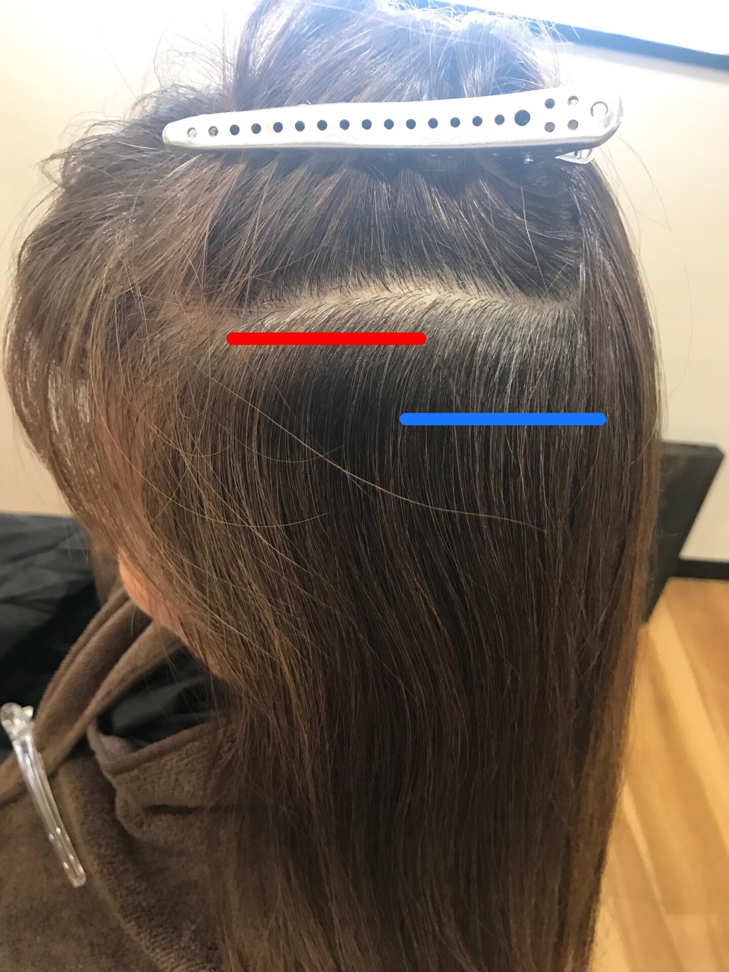 逆に青い線まで薬剤を塗ってしまうと、前回染めた部分をに改めて薬剤がついてしまうことになります。