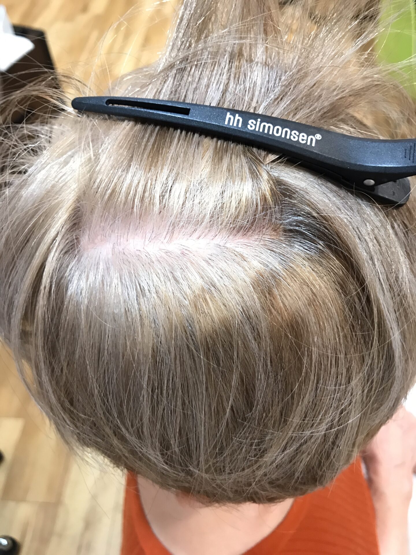 薄いイエローベージュ系の色に近づけることができれば根元の白髪と毛先部分の色の馴染みは良くなります。